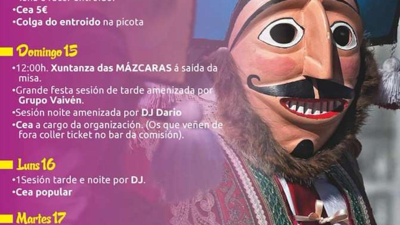 Sábado 14, a las 16.00 horas tendrá lugar la xuntanza para ir a la leña y hacer el Entroido seguida de cena para los participantes. En este día se colgará el Entroido na picota.